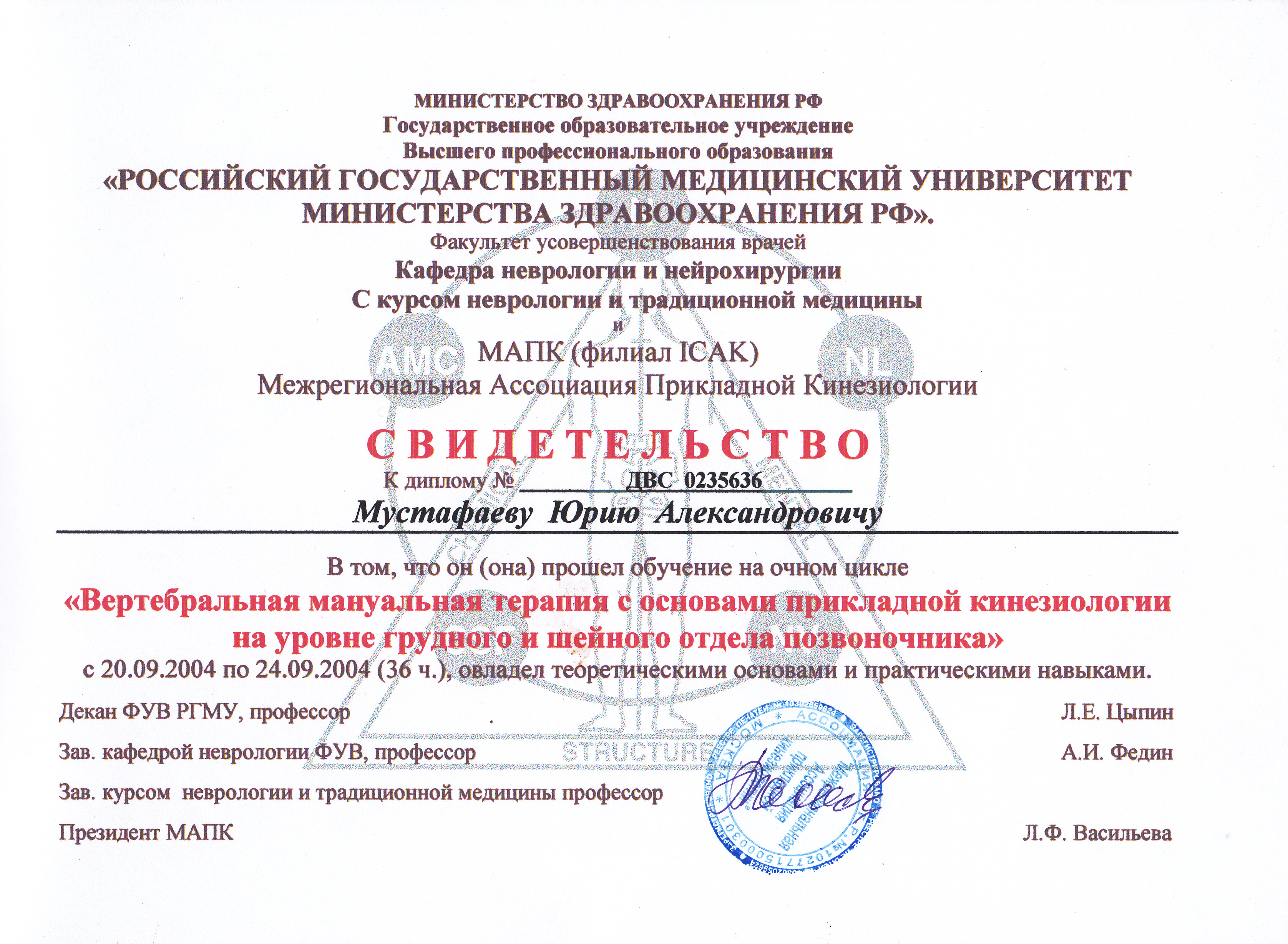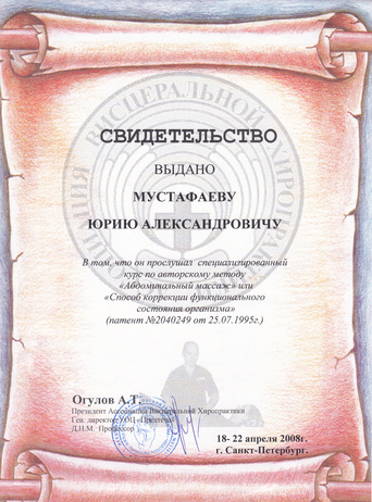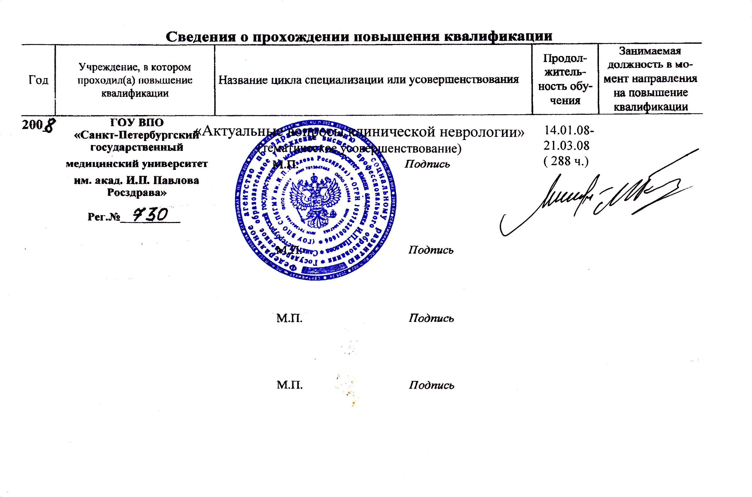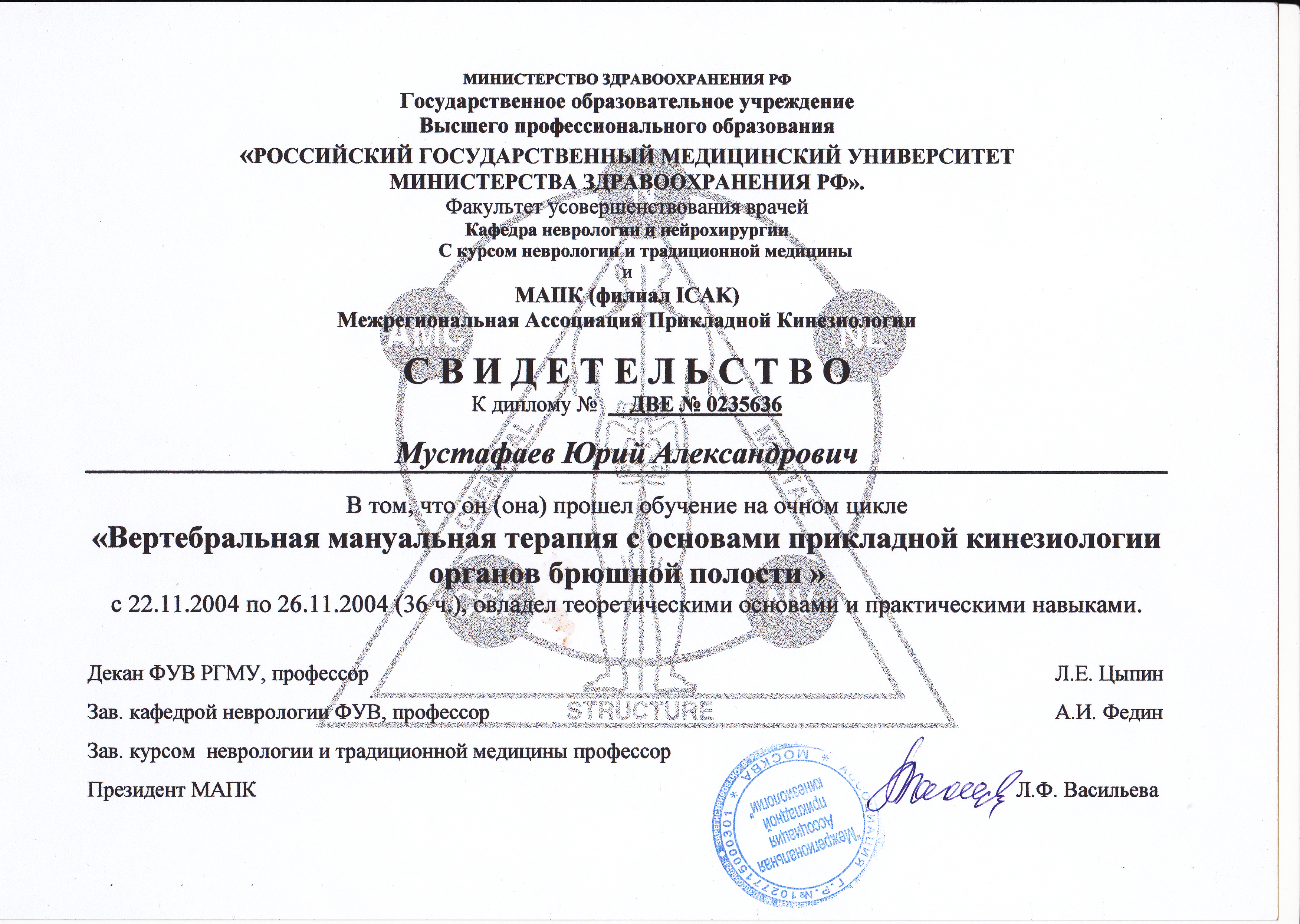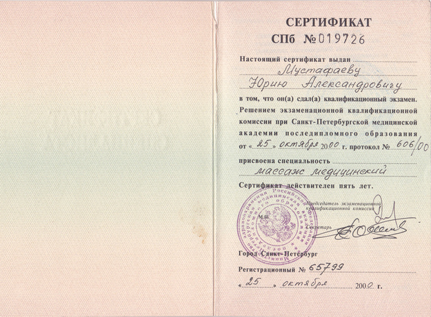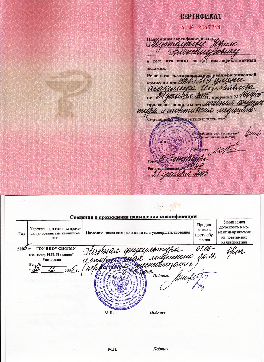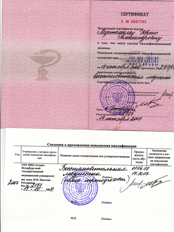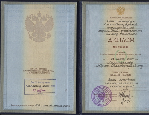 - Диплом Санкт-Петербургского Медициснкого Университета им. акад. И.П. Павлова