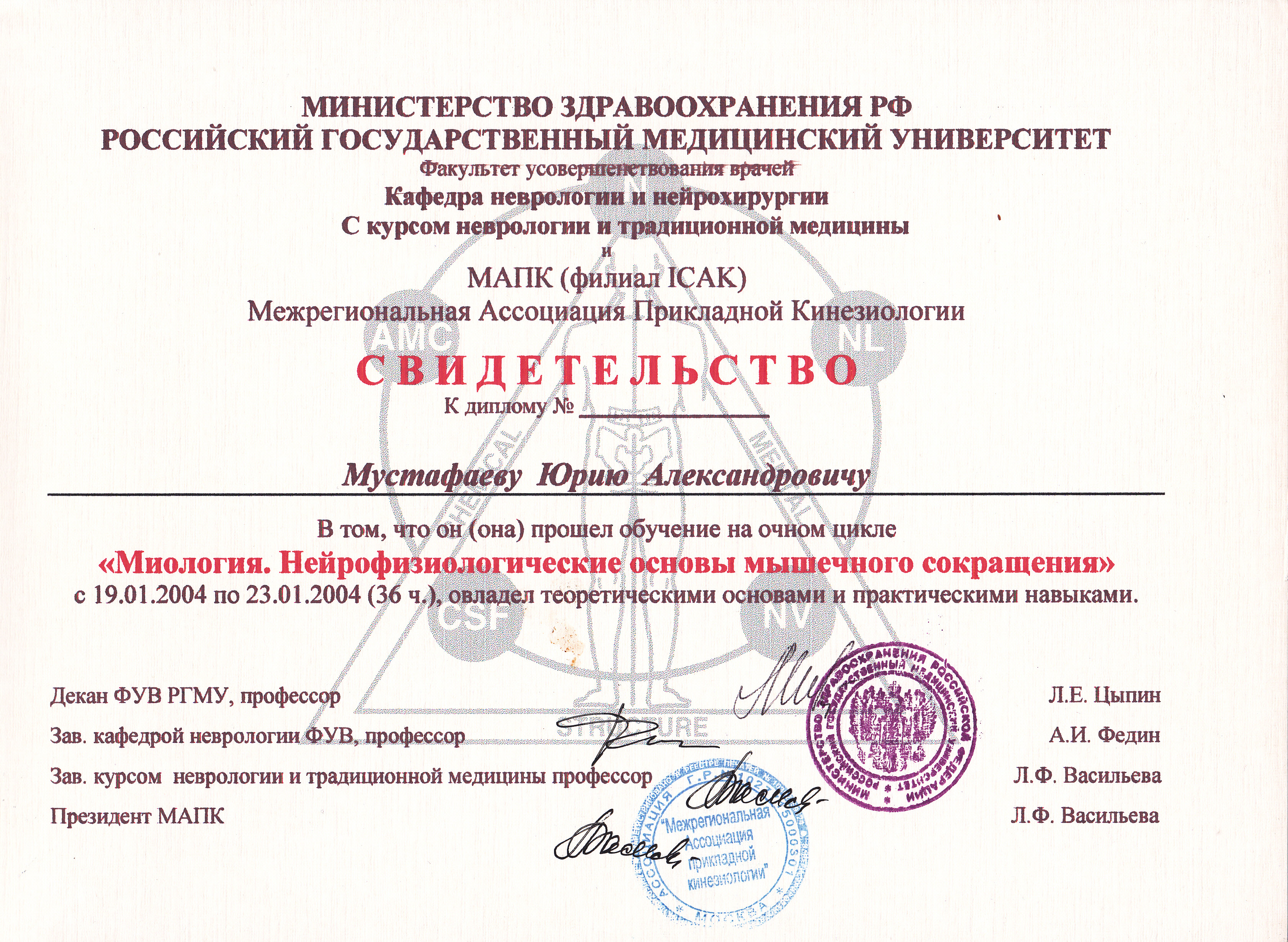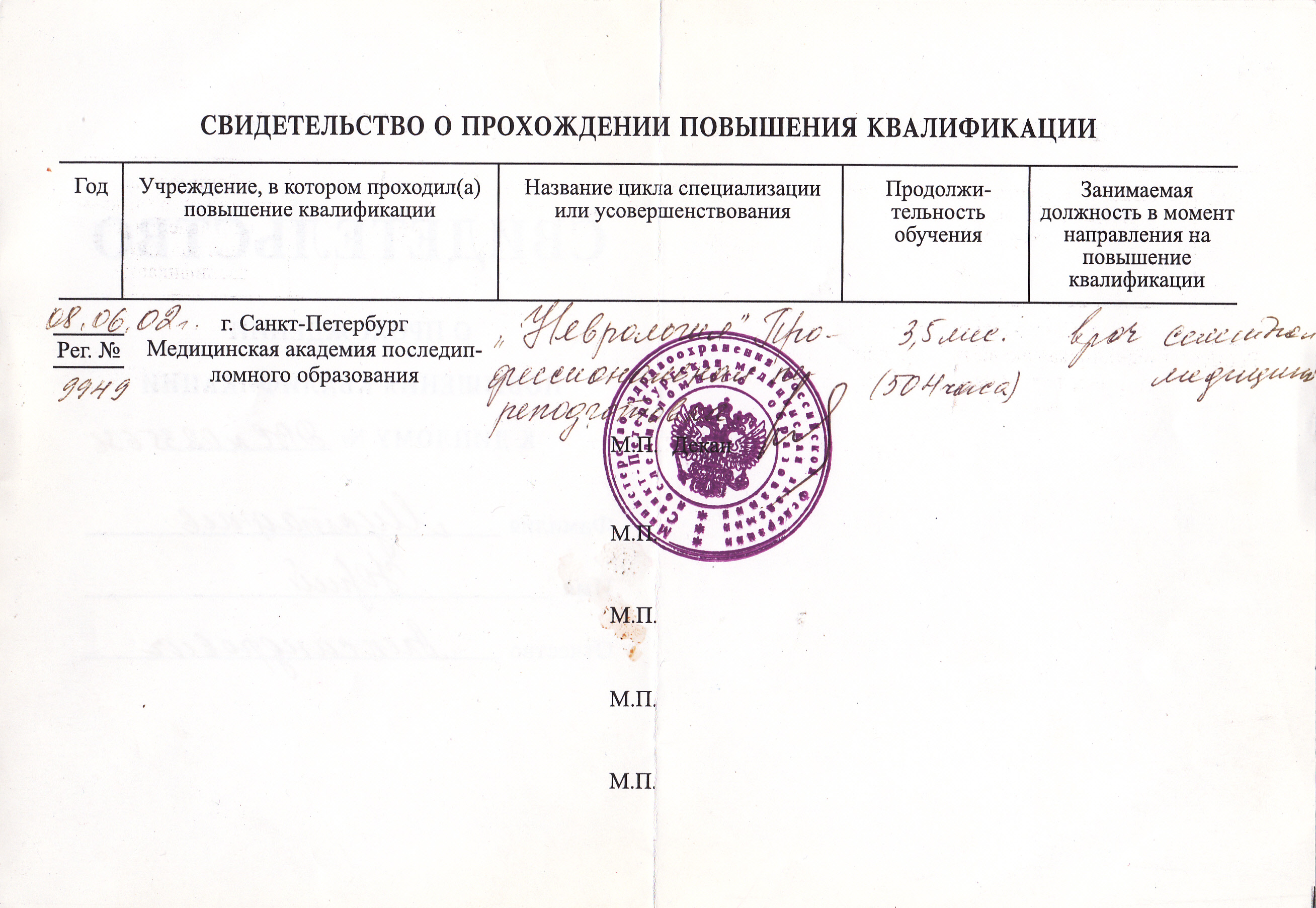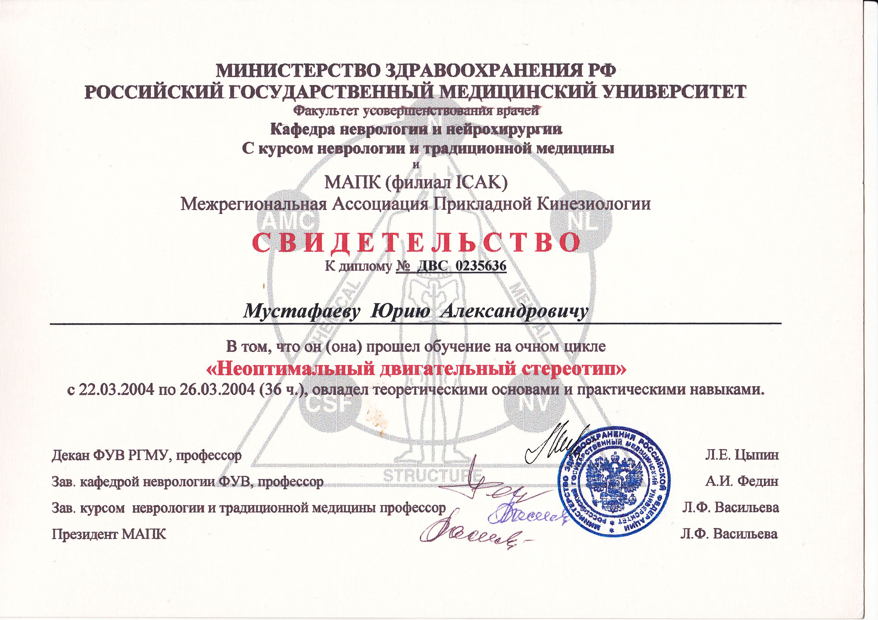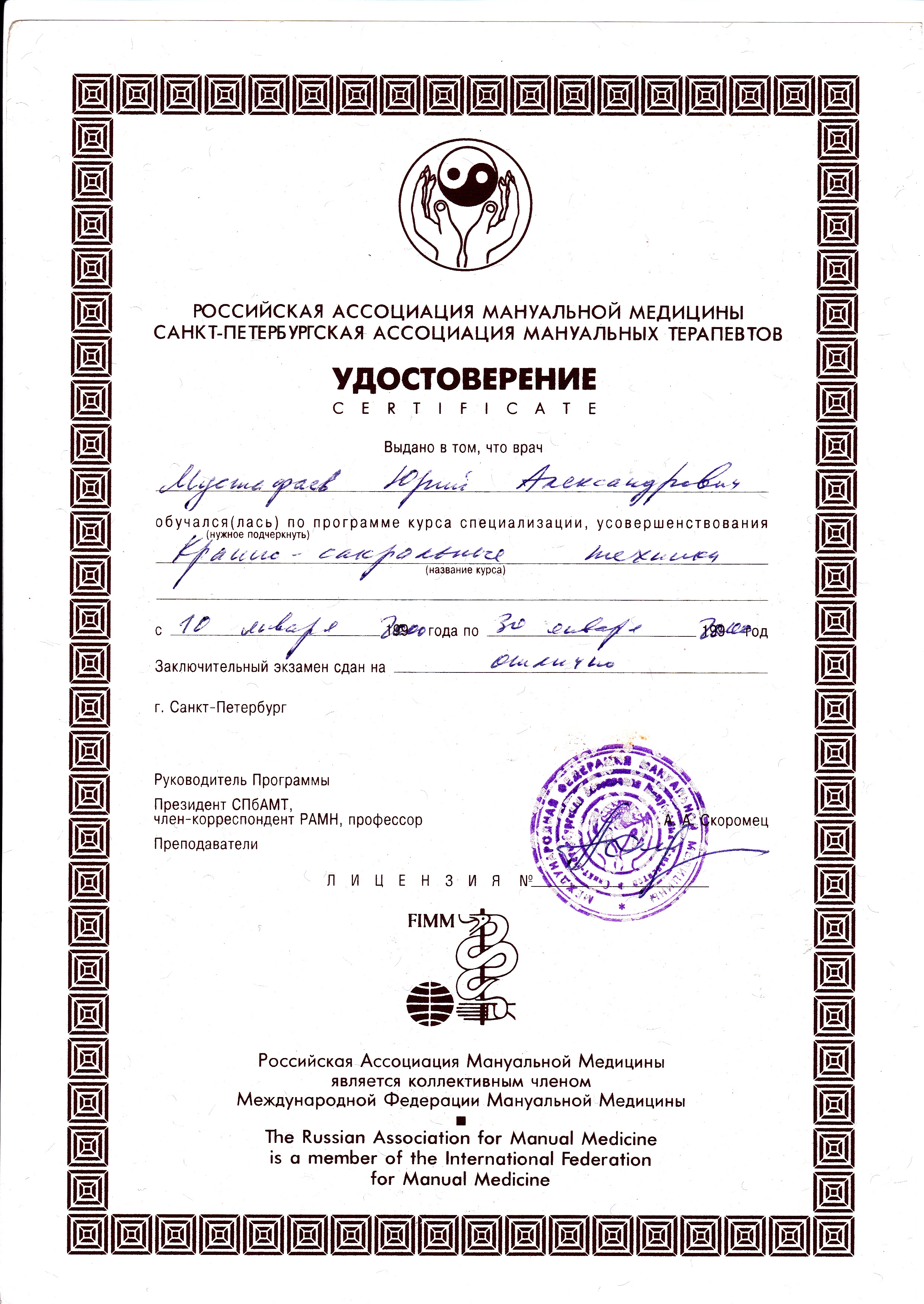 - Диплом Санкт-Петербургского Медициснкого Университета им. акад. И.П. Павлова