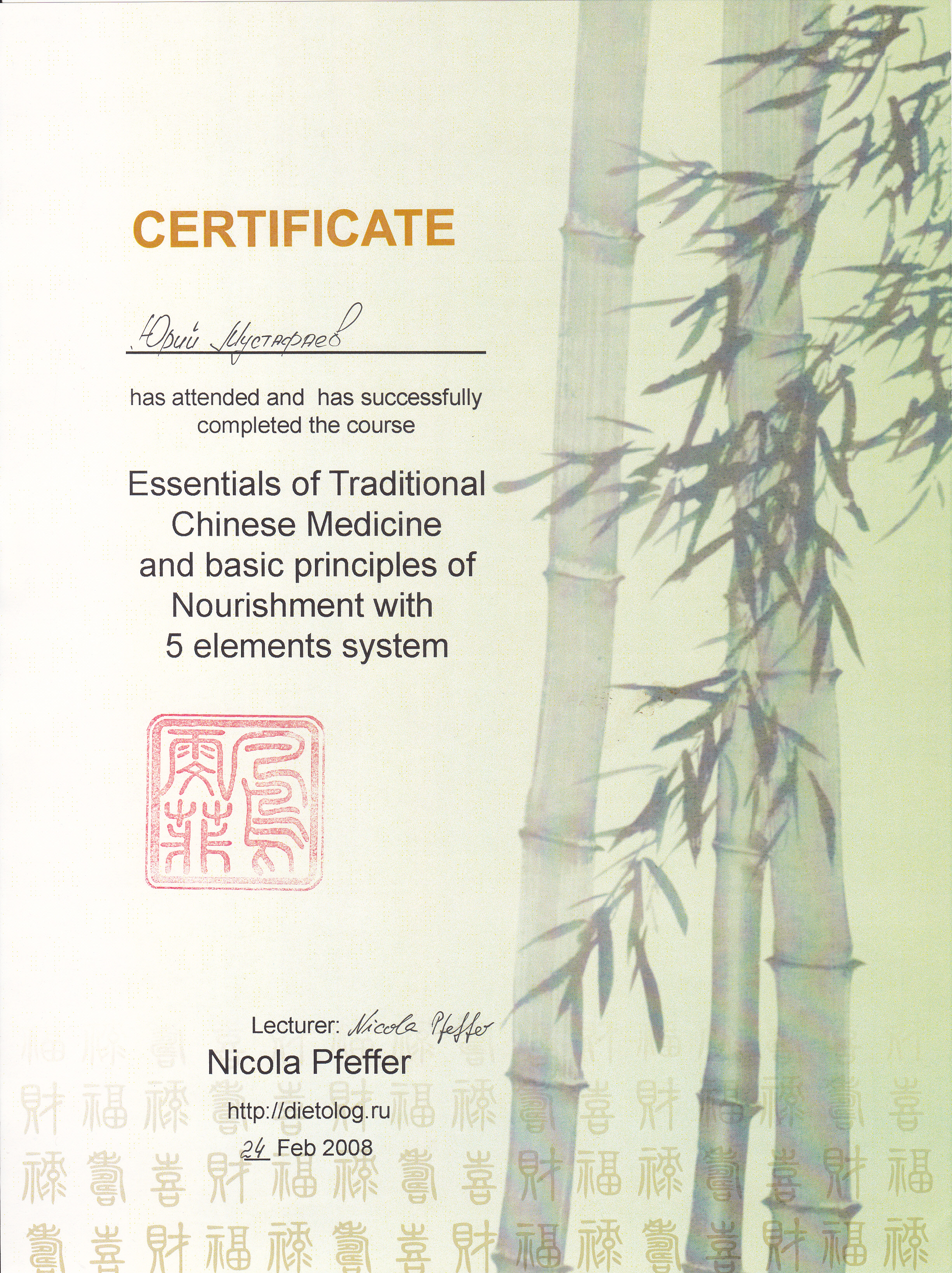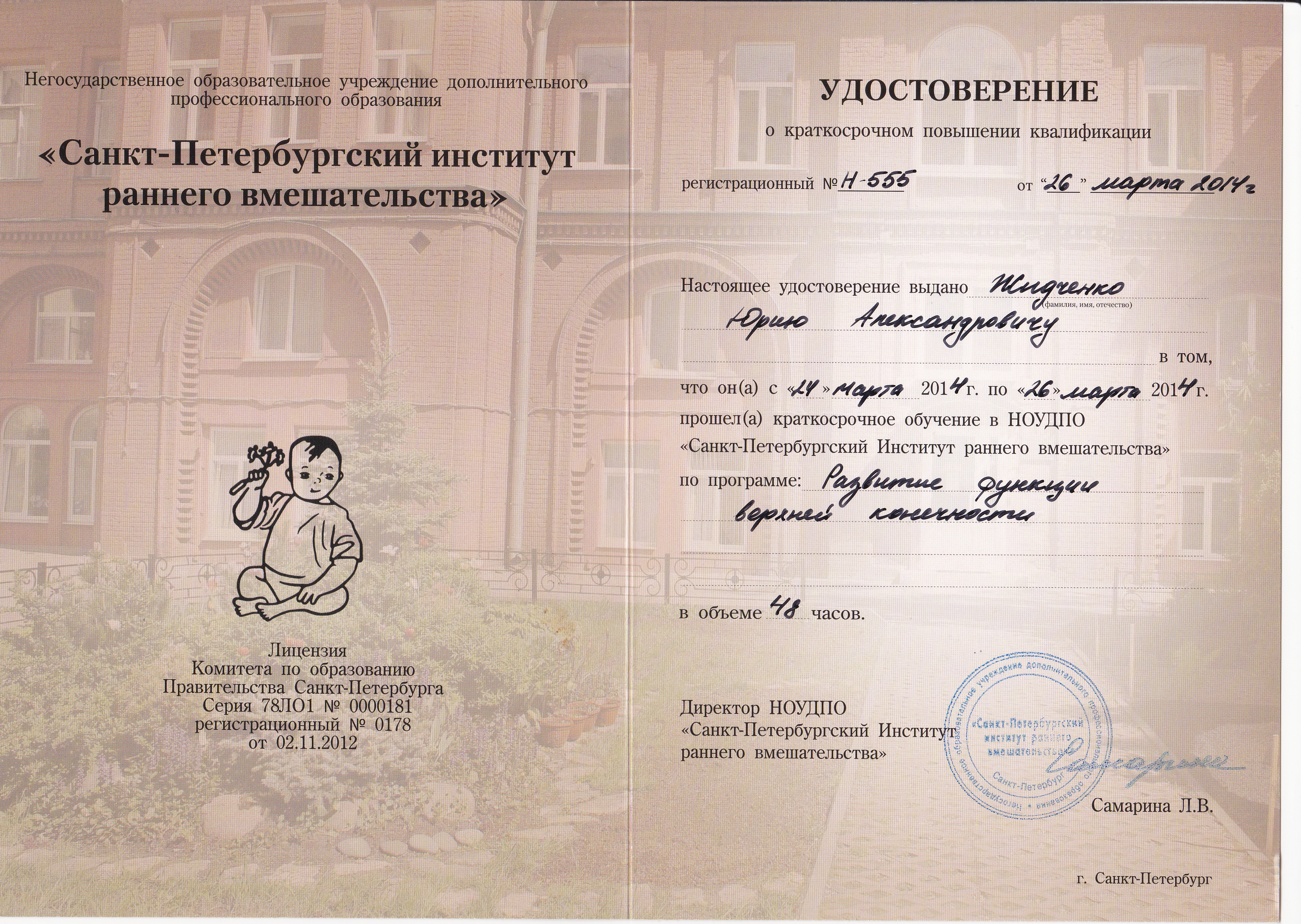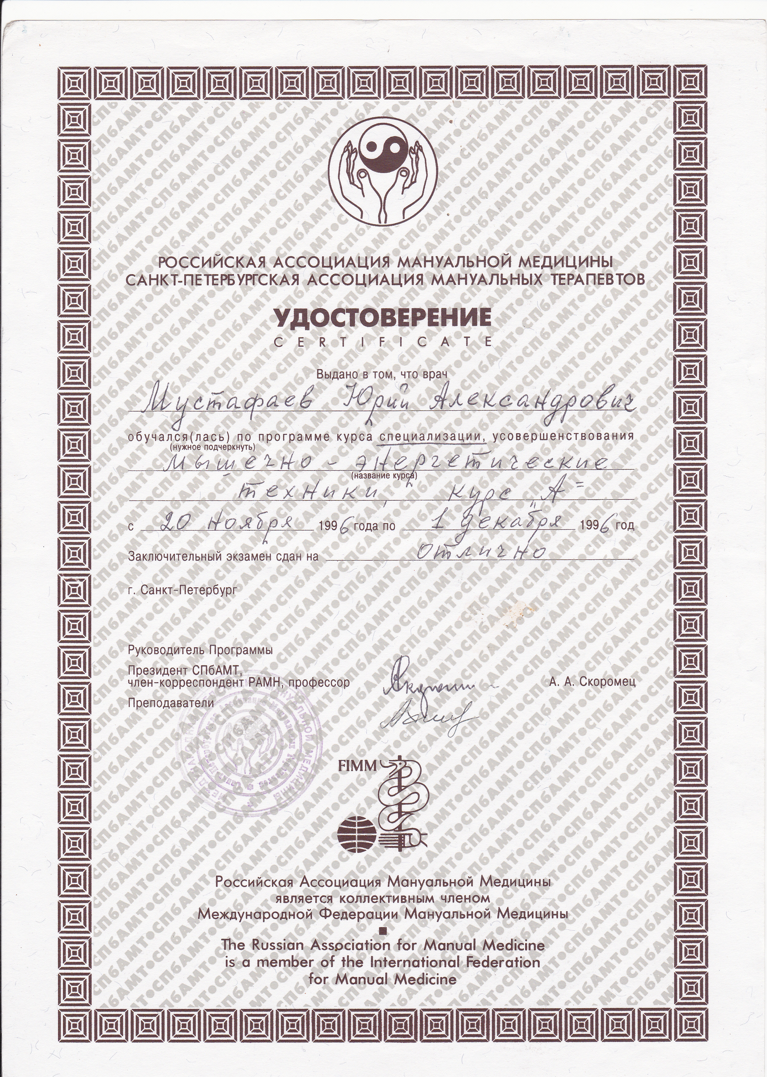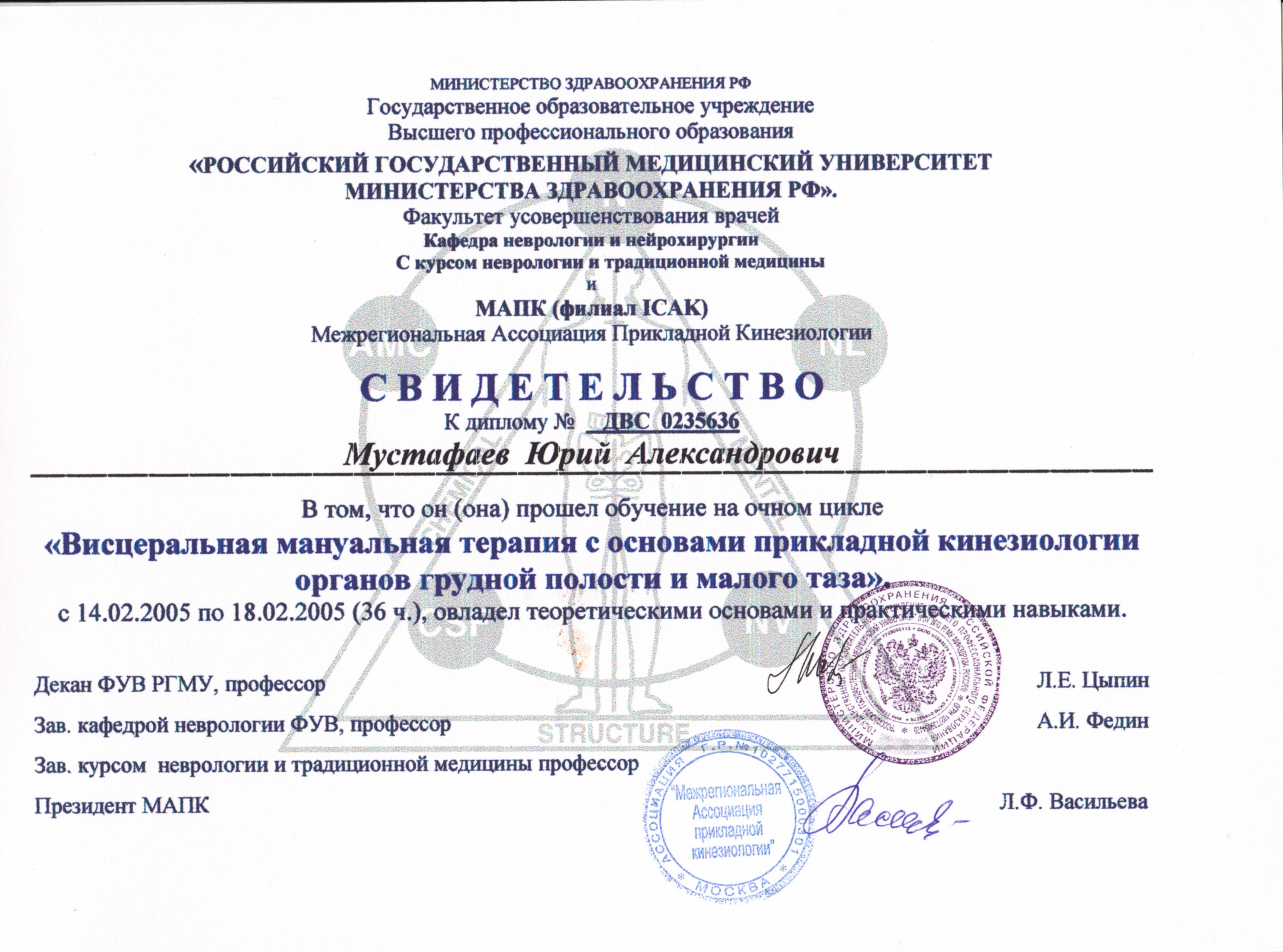 - Диплом Санкт-Петербургского Медициснкого Университета им. акад. И.П. Павлова