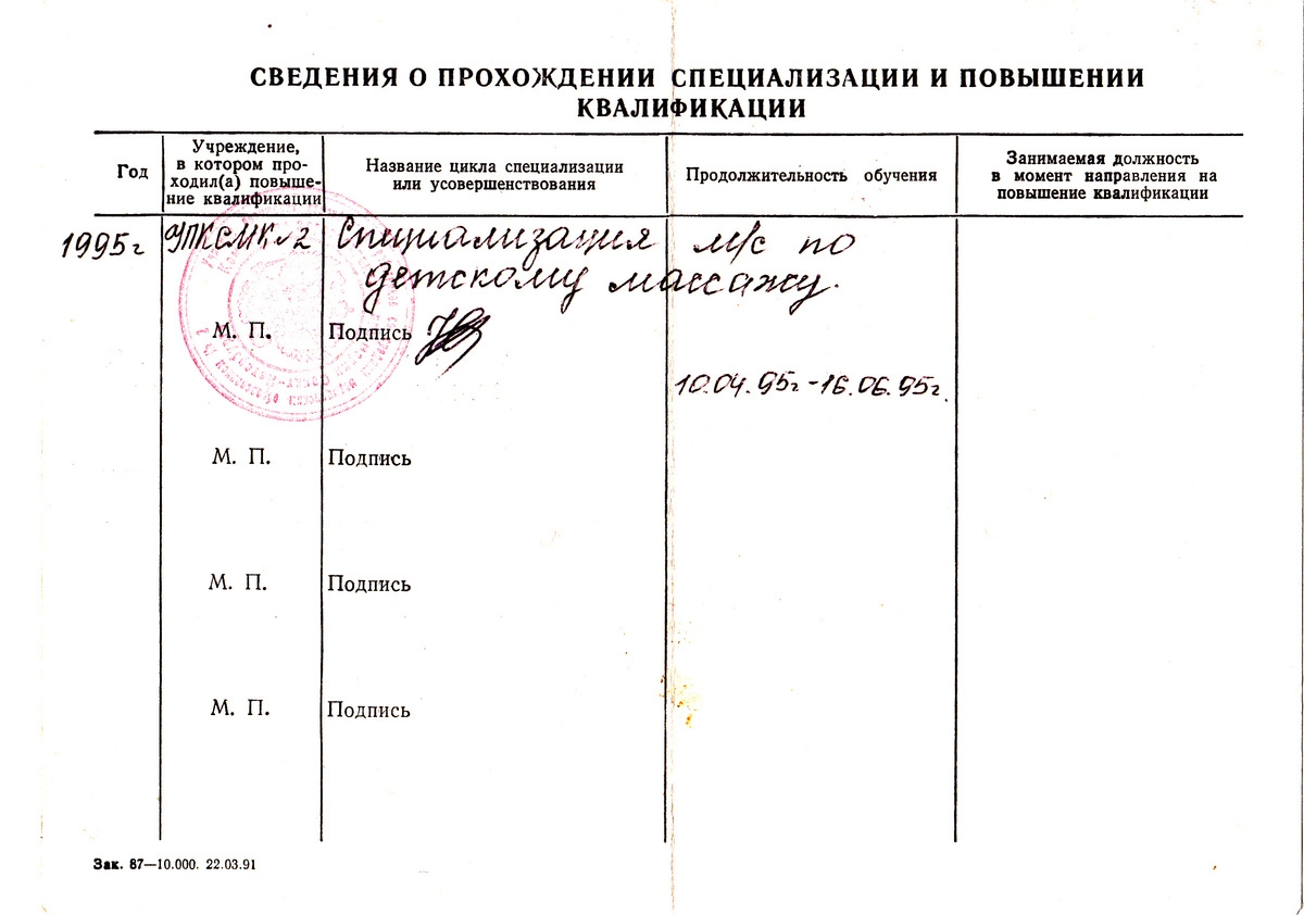 - Медицинский массаж, первичная специализация
